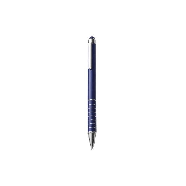 Csavaró mechanikás fém golyóstoll érintőképernyős funkcióval, kék tollbetéttel és 8 díszítő gyűrűvel.